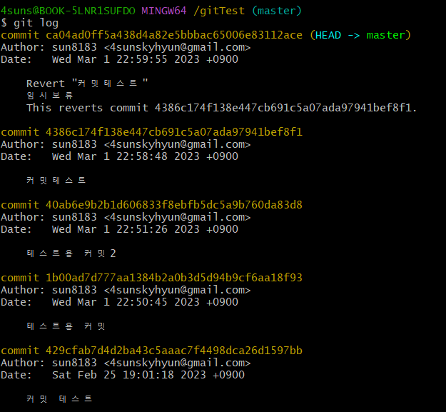 깃 로그에 revert 한 새로운 커밋이 생겼습니다.