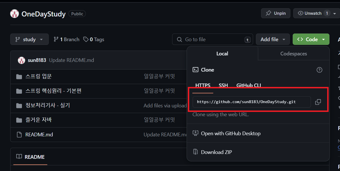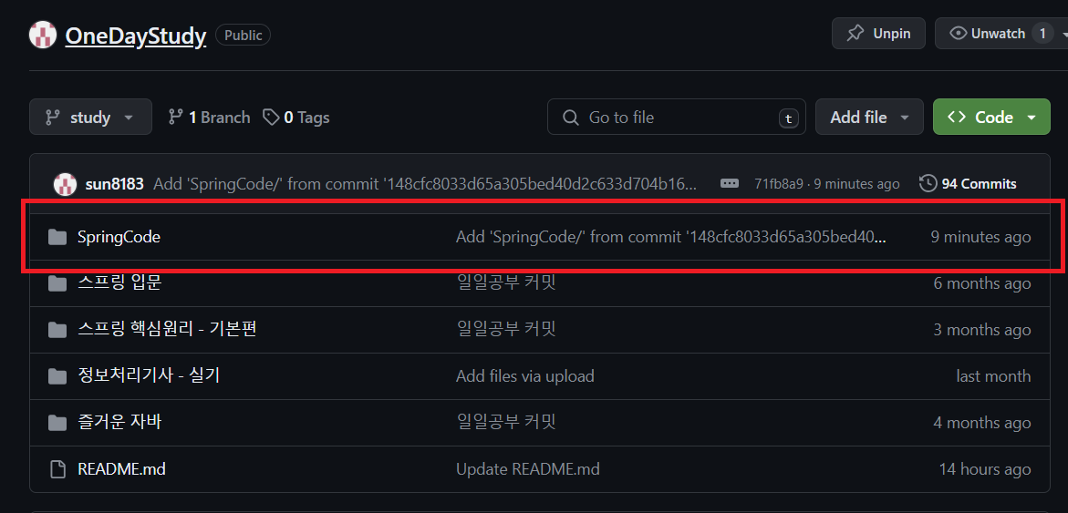 springStudy Repository를 SpringCode 폴더 이름으로 OneDayStudy Repository에 포함된 것을 확인